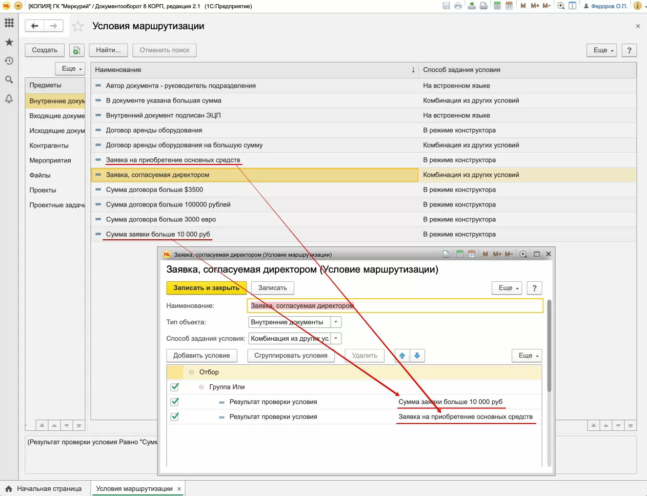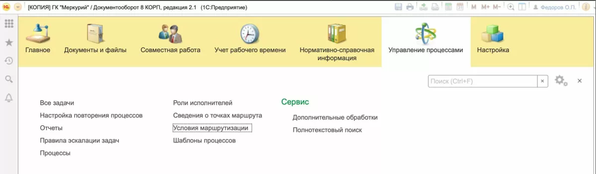 Чтобы настроить условия маршрутизации в 1С Документооборот, переходим в раздел «Управление процессами» и выбираем меню «Условия маршрутизации».
