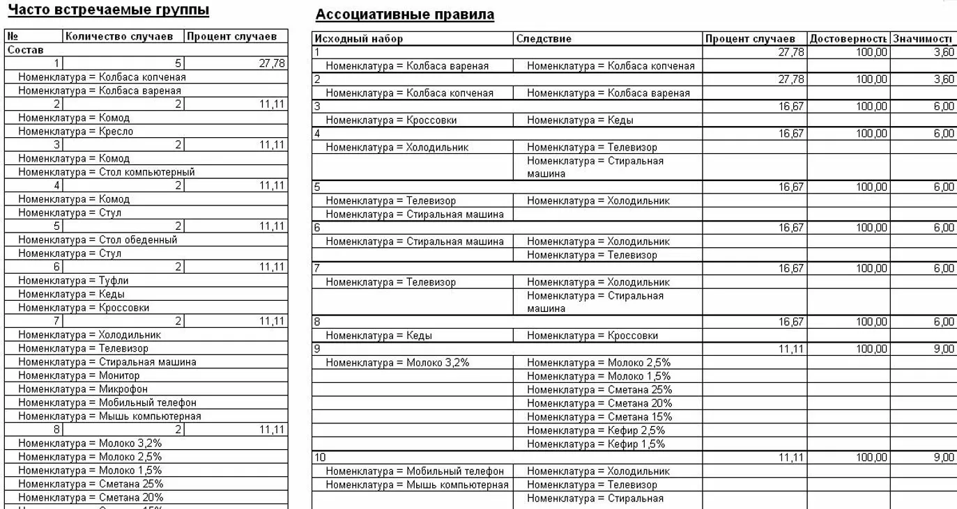 Аналитика = Новый ПостроительОтчетаАнализаДанных; Аналитика.ТипАнализа = Тип("АнализДанныхПоискАссоциаций"); Аналитика.ИсточникДанных = РезультатЗапроса; Аналитика.Выполнить(); Аналитика.Вывести(Результат);