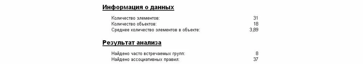 В результате мы видим исчерпывающую картину, из которой можно сделать достаточно выводов по поступающей номенклатуре. В первую очередь, механизм подсчитал количество объектов, элементов и среднее количество номенклатуры в документе. Также нам демонстрируется, что нашли 8 групп и 37 закономерностей с определенной долей вероятности.