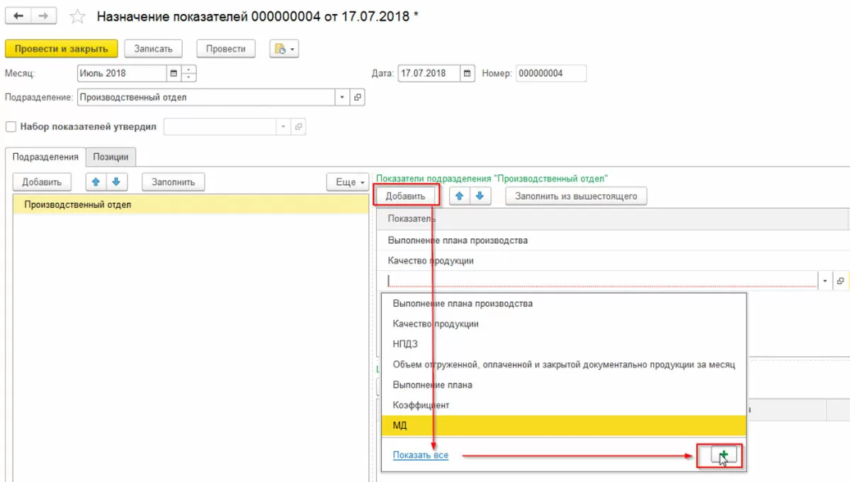 Для назначения показателей используется документ «Назначение показателей». Создадим такой документ для подразделения «Производственный отдел». Сами показатели можно создавать либо из меню (пункт «Показатели эффективности»), либо непосредственно из документа «Назначение показателей», как показано на рисунке ниже.