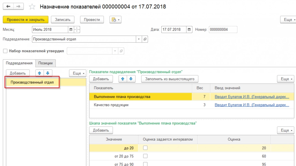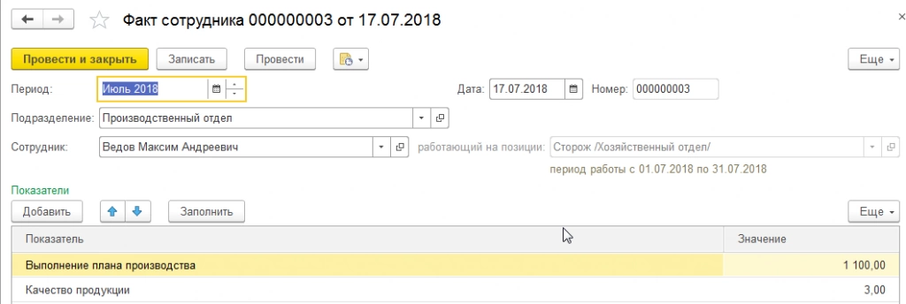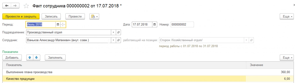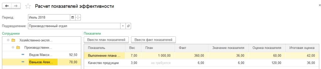План производственного отдела – 1000 единиц. Фактические показатели сотрудников вводятся одноименными документами.