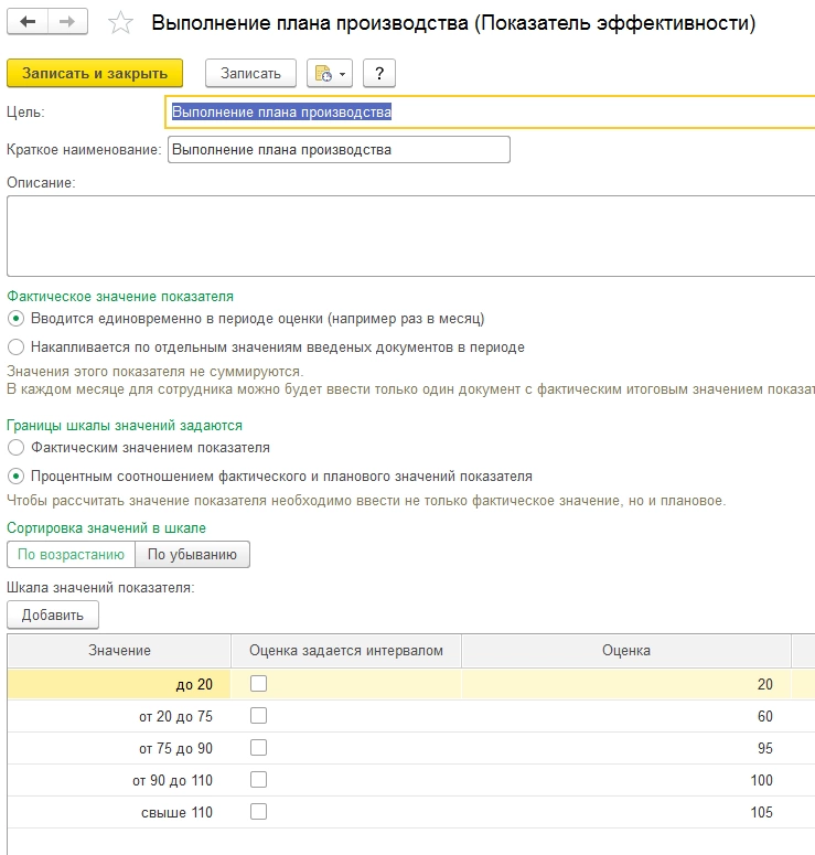 - Выполнение плана производства. Он задается по шкале (см. рисунок ниже) в зависимости от процента выполнения плана.