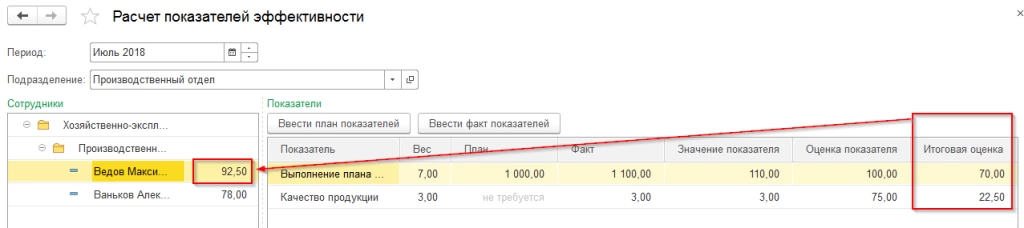 Контроль процесса осуществлялся с помощью обработки «Расчет показателей эффективности», которая показывает значения рассчитанных показателей и общую оценку (ПЭ) еще до того, как зарплата рассчитана.