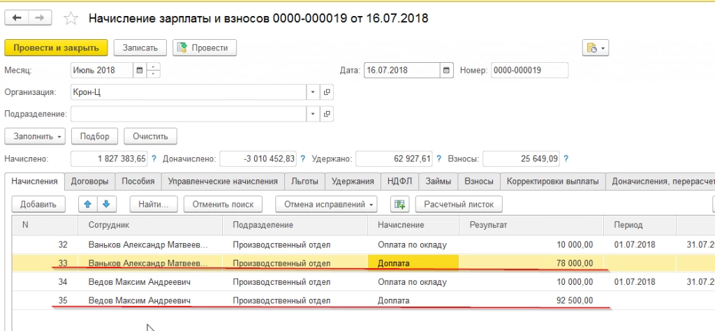 Далее мы ввели значение планового показателя для подразделения в июле 2018 года, а затем фактические показатели работы для каждого сотрудника в том же периоде. После этого в расчете заработной платы начислялась сумма доплаты.