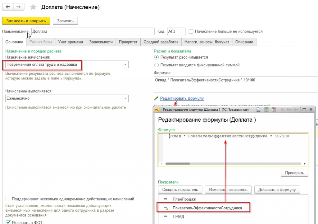 При редактировании формулы используем предопределенные показатели «Оклад» и «ПоказательЭффективностиСотрудника». Заметим, что в данном примере мы будем рассчитывать доплату вместе с окладом, поэтому в поле «Назначение начисления» устанавливаем «Повременная оплата труда и надбавки». Если мы в этом поле установим значение «Премия», то данные будут рассчитываться документом «Премия».