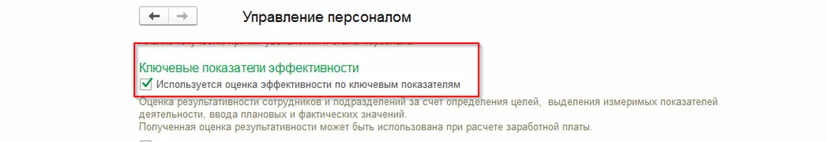 Для этого необходимо выбрать пункт меню «Настройка – Управление персоналом». Далее найти заголовок «Ключевые показатели эффективности» и установить флажок «используется оценка эффективности по ключевым показателям»: