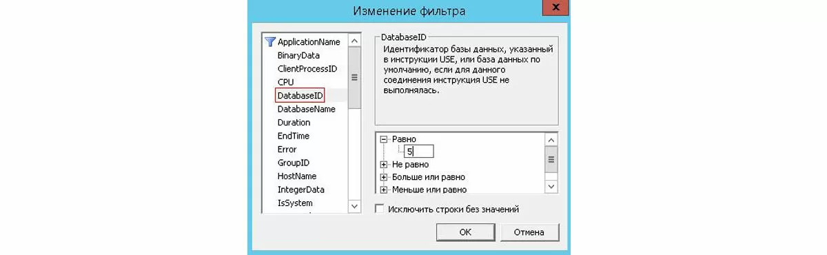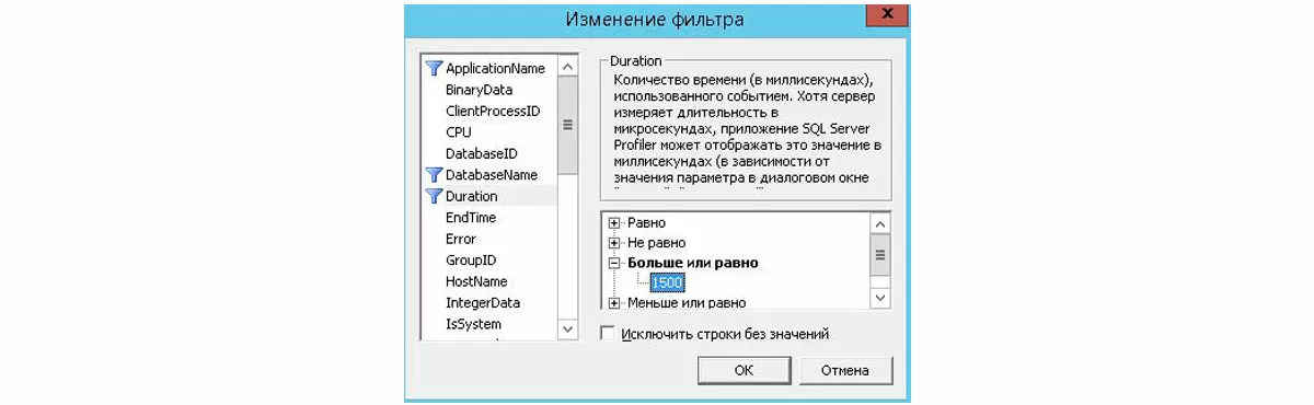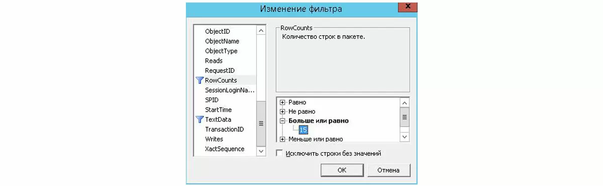 - RowCounts – отбор по количеству возвращаемых строк. Так вы можете отловить запросы, возвращающие огромное количество строк, чтобы наложить дополнительные условия.