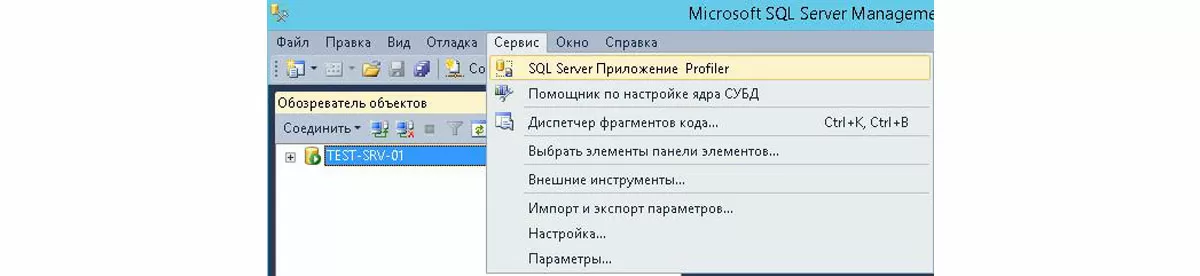 Чтобы открыть MS SQL Profiler и начать работу с базами данных, надо запустить MS SQL, в открывшемся окне, в меню «Сервис» найти нужное приложение и открыть его. По щелчку откроется еще одно окно с просьбой указать сервер, где находятся наши клиент-серверные базы данных. Вы можете подключаться к нескольким серверам и разбираться в структуре их запросов к SQL.