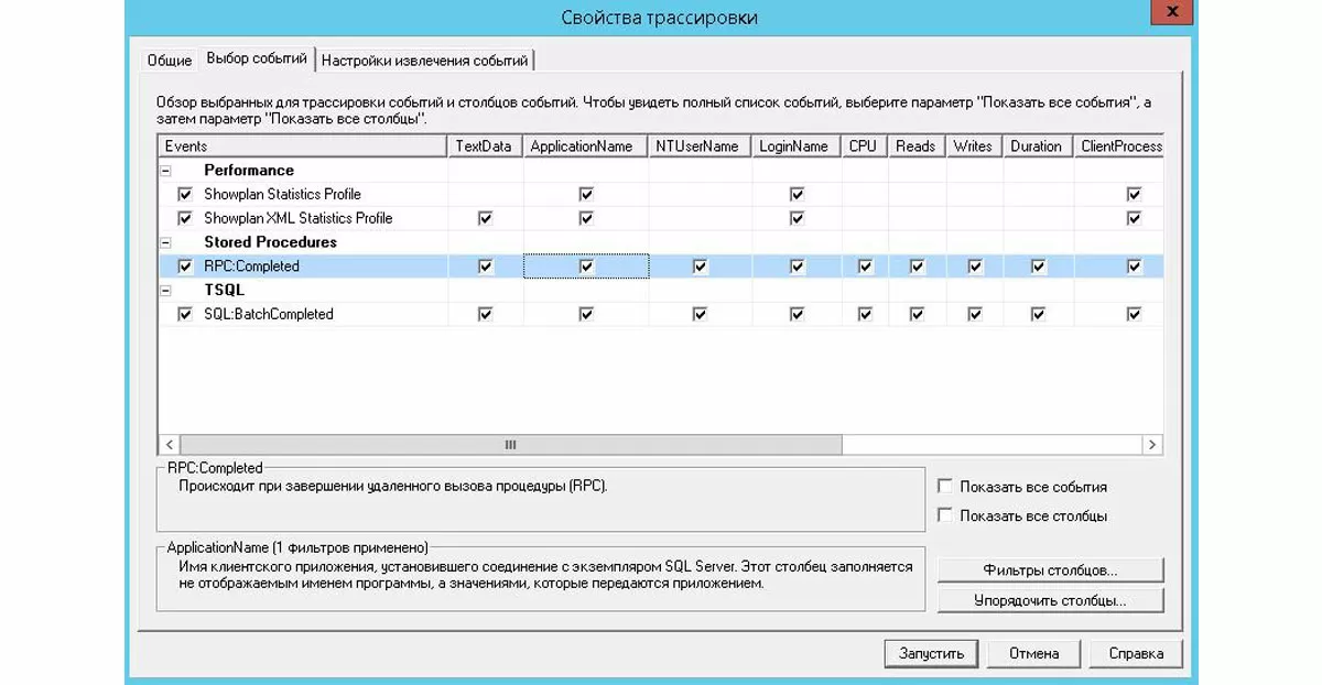 Возможностей намного больше, и если необходима дополнительная настройка – воспользуйтесь подсказками MS SQL Server Profiler, отображающимися в этом же окне. После вышеперечисленных этапов настройки остается только воспользоваться кнопкой «Запустить» и наблюдать за отображением процессов. Окно трассировки разделено на 2 части: в верхней перечисляются события и их характеристики, а в нижней – дополнительная информация.