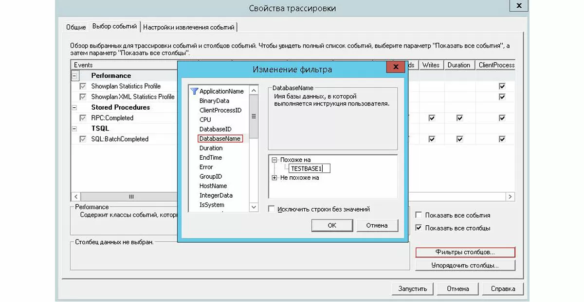 После сделанной настройки мы сможем увидеть все запросы для всех баз данных, зарегистрированных на указанном сервере. Чтобы исследовать данные конкретной базы, необходимо настроить фильтры для выбранных событий. С помощью кнопки на форме настроек «Фильтры столбцов…» укажем следующие свойства нашей трассировки: