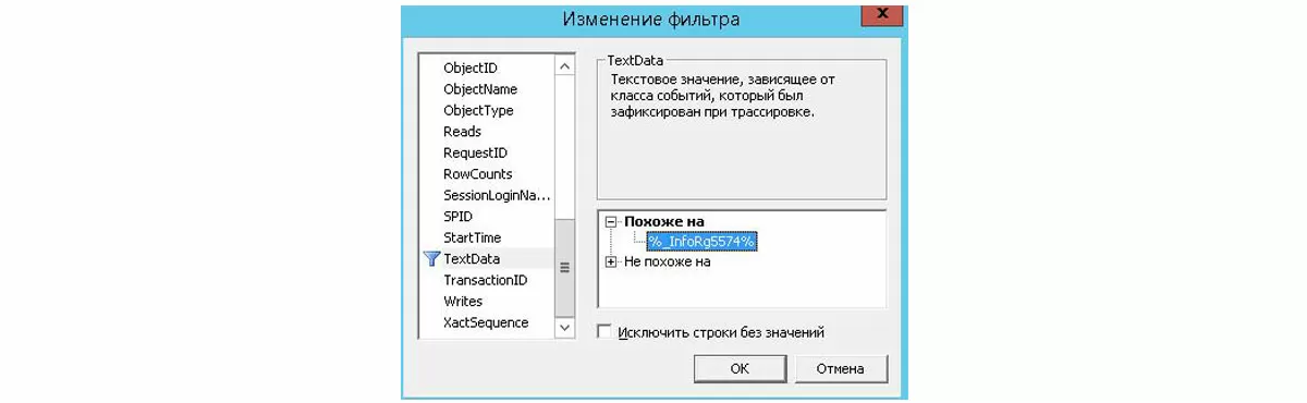 - TextData – фильтр по тексту запроса. Можно отобрать только обращающиеся к конкретной таблице или полям. Необходимо воспользоваться маской из синтаксиса 1С;