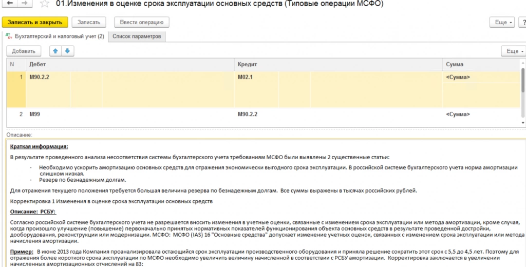 По каждой операции настроены шаблоны проводок МСФО, а также приведено подробное описание и пример использования данной корректировки на практике.