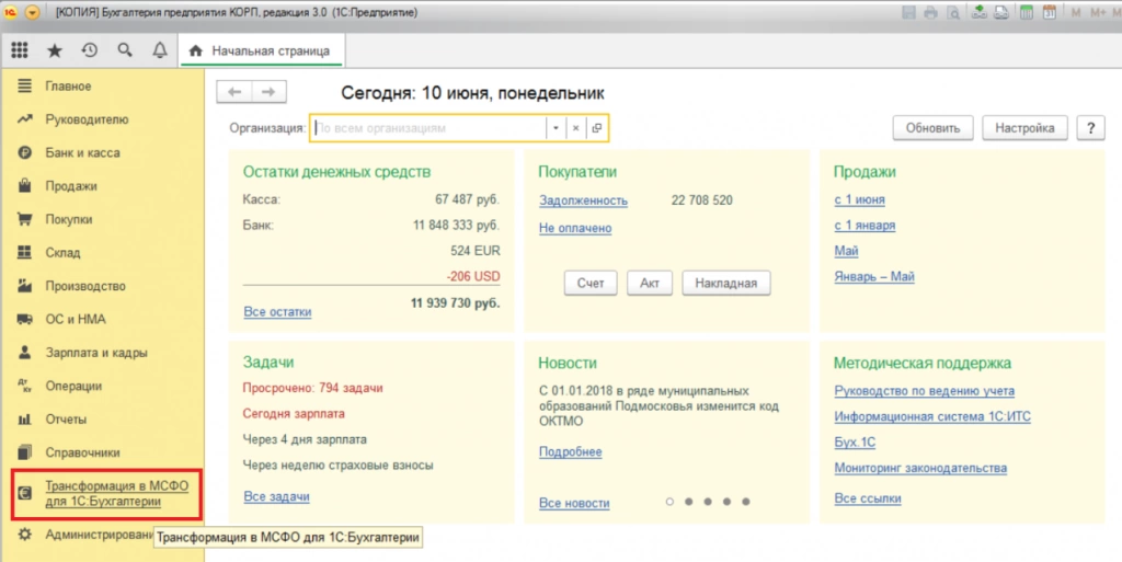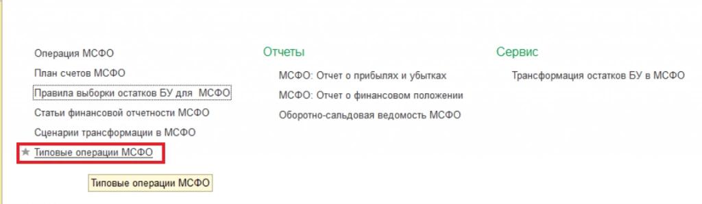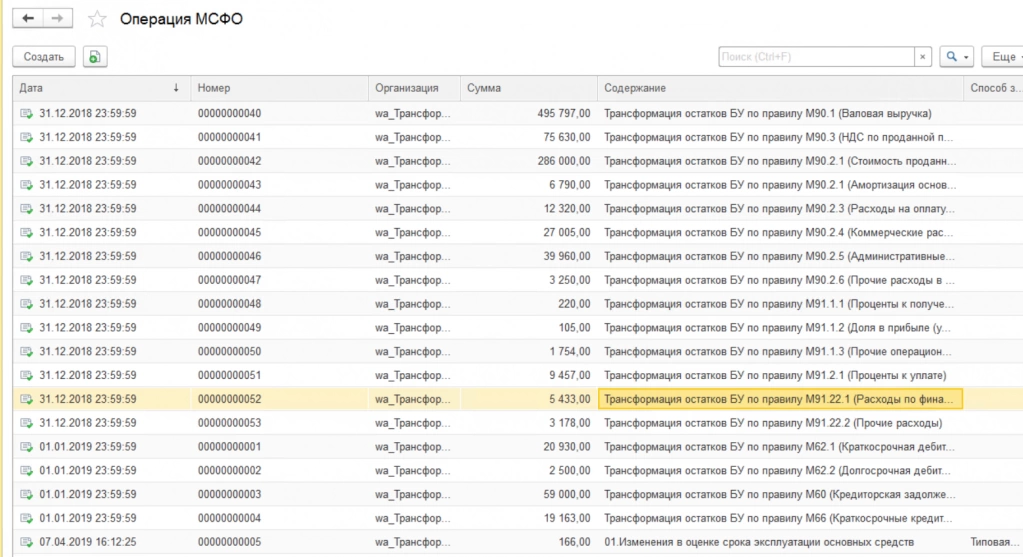 В результате процесса трансформации в программу загружаются документы «Операция по МСФО», которые обеспечивают перенос (трансформацию) бухгалтерских остатков на план счетов МСФО.