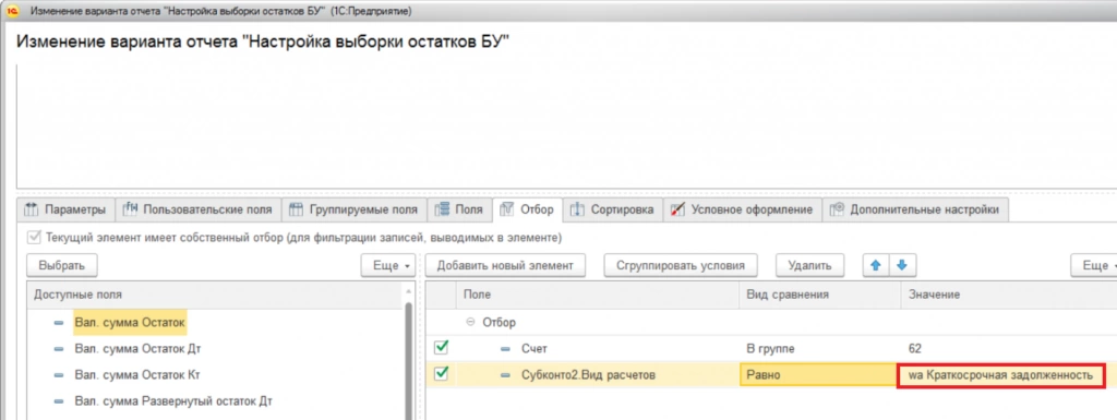 Подсистема позволяет настроить любые правила – условия отбора, сложные фильтры и пр. Например, отбор данных по определенным значениям субконто и субсчетов.