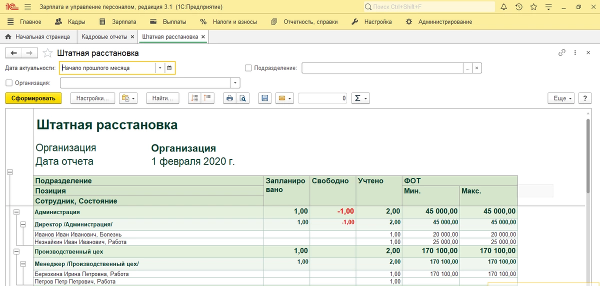 В разделе «Кадровые отчеты» отчет «Штатная расстановка» позволяет проанализировать всю введенную информацию.