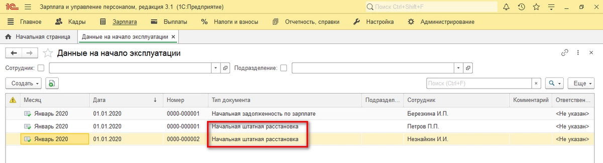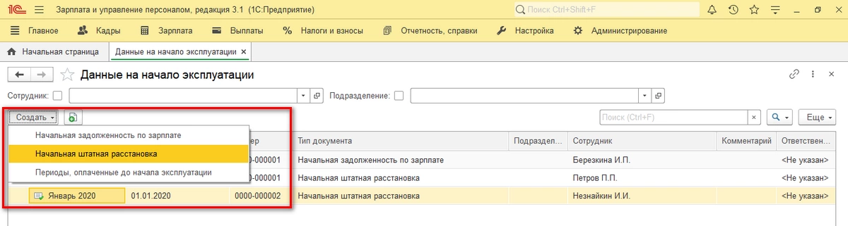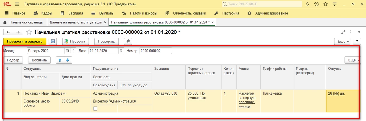 Заполнение документа Начальная штатная расстановка в 1С:ЗУП 3.1