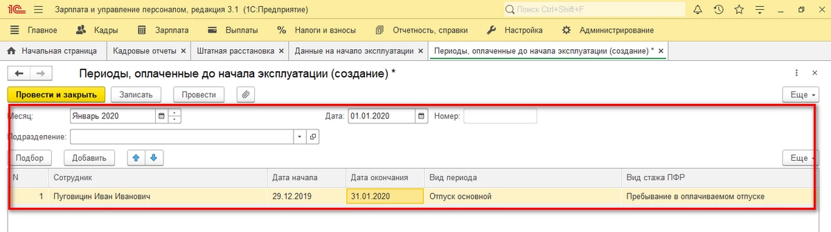 Этот документ предназначен для ситуаций, когда для сотрудника в предыдущей программе (например, в версии 1С ЗУП 2.5) был оформлен и рассчитан документ, фиксирующий его отсутствие на работе. Если отсутствие продолжается в периоде, в котором уже выполнен переход на версию 1С ЗУП 3.1, то в документе «Периоды, оплаченные до начала эксплуатации» по данному сотруднику будут заполнены поля «Дата начала» и «Дата окончания», соответственно. За этот период заработная плата начисляться не будет. Отражаться данные ситуации будут согласно состоянию на основании введенных данных.