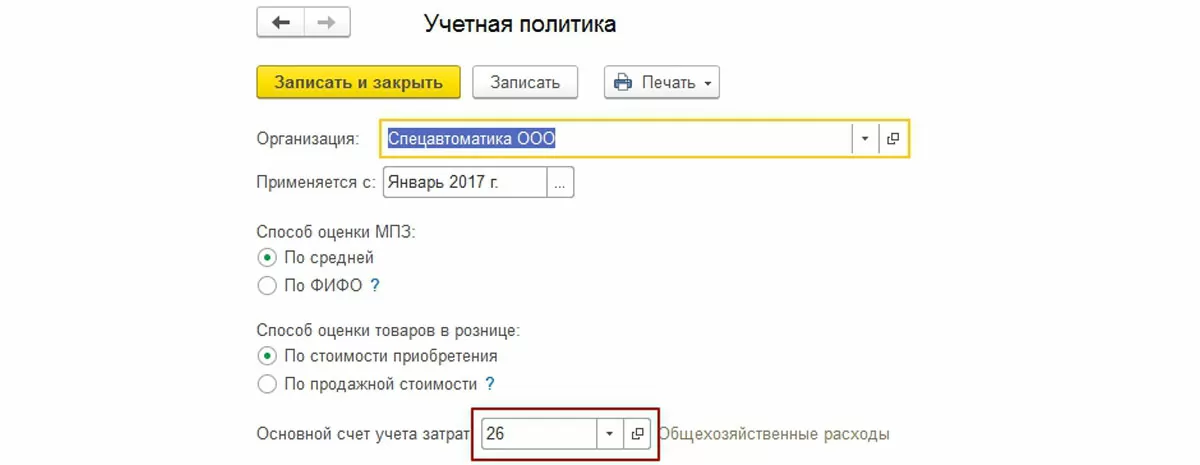 Элемент принадлежит конкретной организации, в нашем случае – ООО «Спецавтоматика». В нем указывается счет затрат. По умолчанию счет затрат подставляется из учетной политики организации, настроенной при начале эксплуатации бухгалтерской конфигурации. Перейти к учетной политике можно через ссылку в карточке организации.