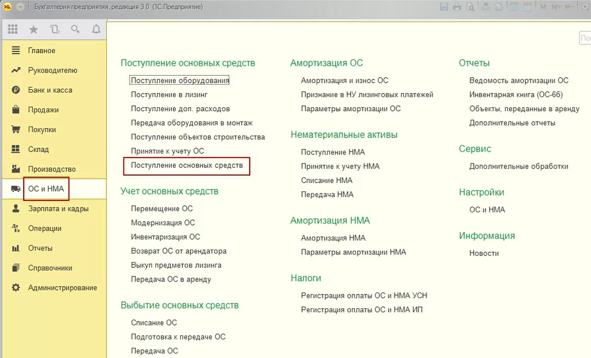 Программные продукты 1С для автоматизации бухгалтерского учета позволяют зарегистрировать ОС в бухучете с помощью «Поступления основных средств», которое доступно из раздела «ОС и НМА» основного меню системы.