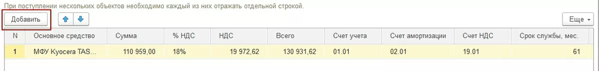 Завершается заполнение табличной части указанием стоимости основного средства, ставки НДС, срока полезного использования.