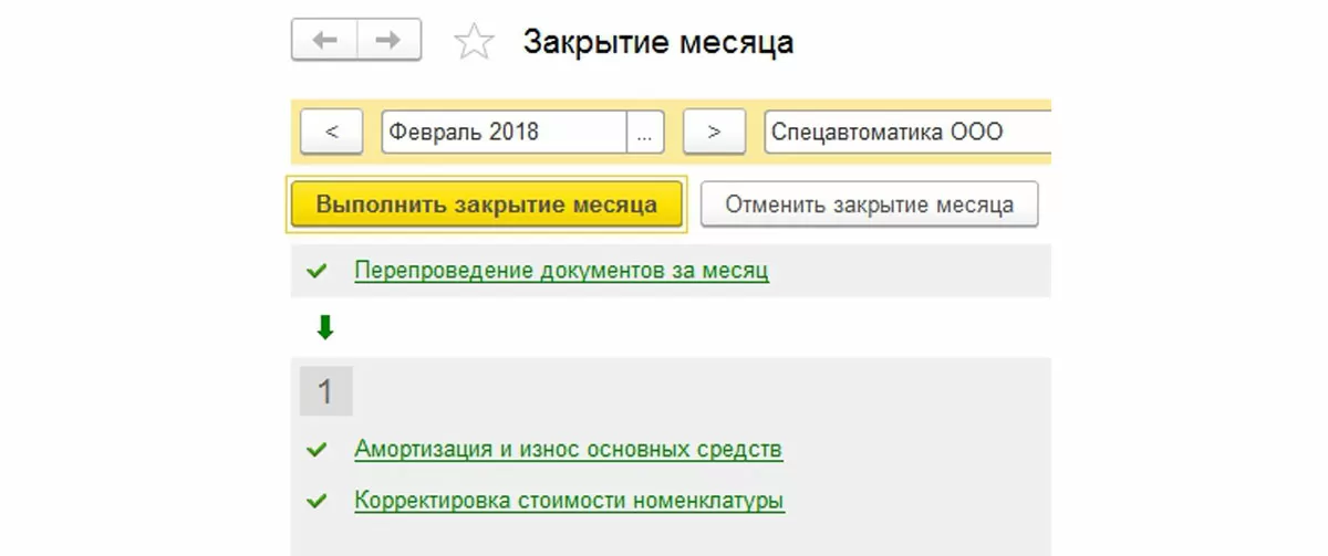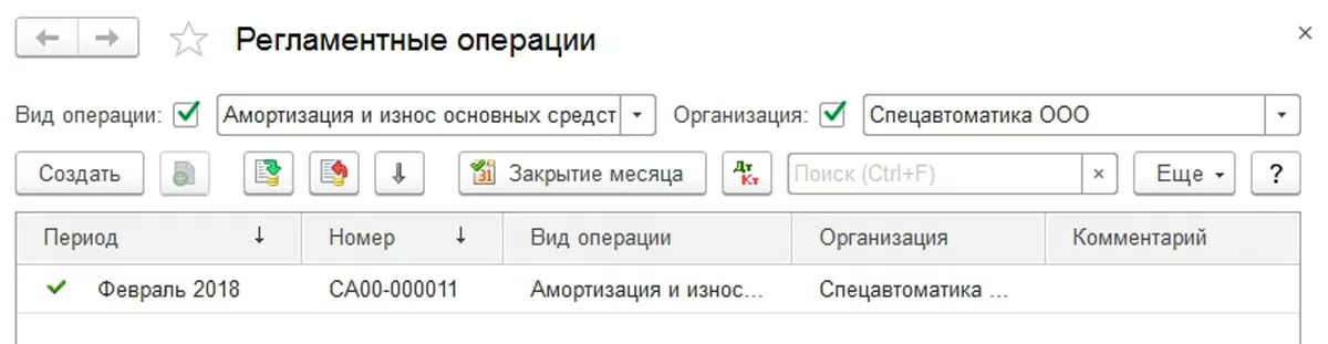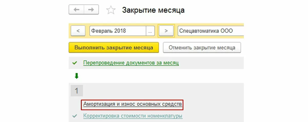 Для совершения операции необходимо нажать на кнопку «Выполнить закрытие месяца» и в системе будет сначала выполнения процедура перепроведения документов, а затем, рассчитается амортизация. Если амортизация рассчитана без ошибок, то строка-процедура начисления изменит цвет на зеленый.