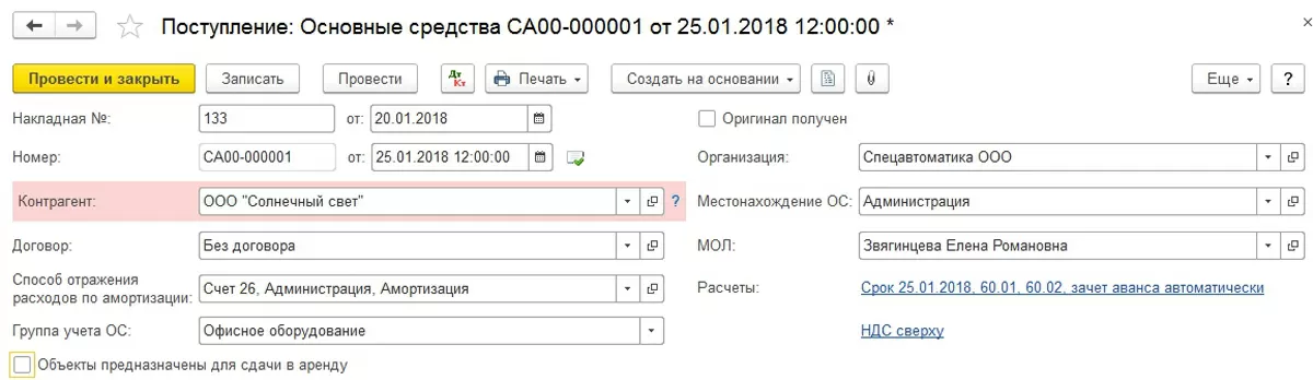 Обращает на себя внимание тот факт, что документом «Поступление ОС» можно зарегистрировать основное средство, амортизирование которого будет зачислено линейным способом. Для выбора других способов рекомендуется использовать последовательное создание документов «Поступление (акт, накладная)» и «Принятие к учету ОС».