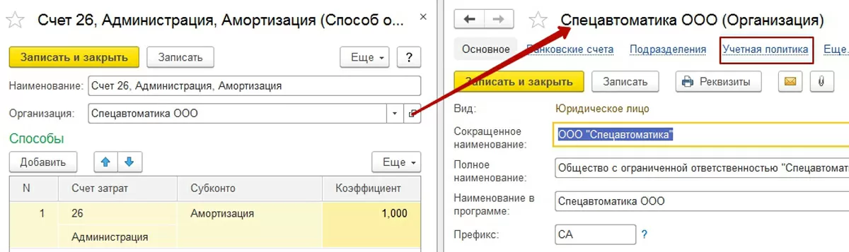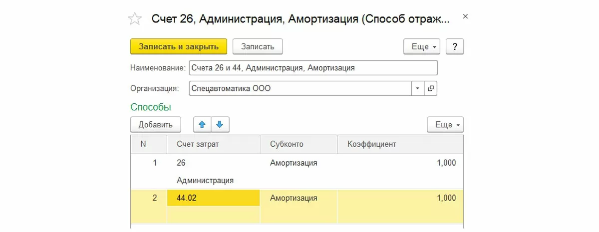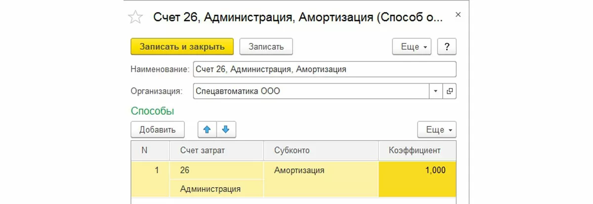 В приведенном примере значения коэффициентов равны единицам, они означают, что амортизация будет поровну/пополам разделена и начислена между затратными счетами 26 и 44.