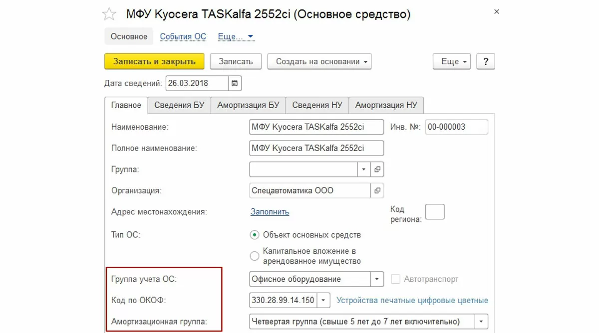 Для корректного начисления нужно заполнить в карточке группу учета ОС, код общероссийского классификатора основных фондов (ОКОФ)* и амортизационную группу.