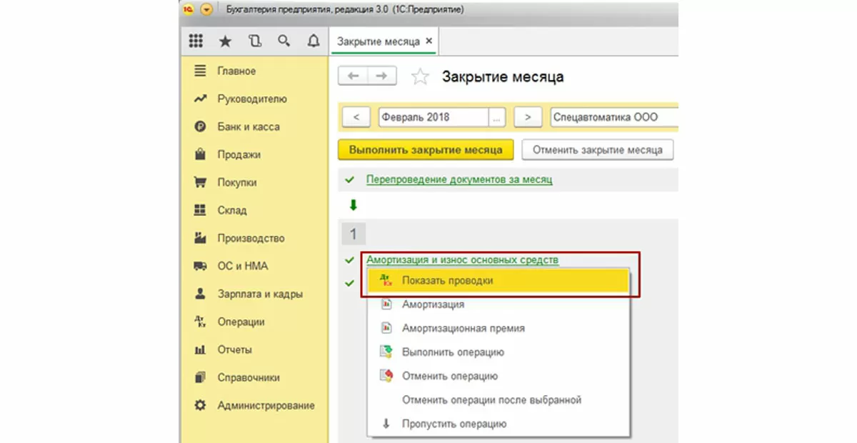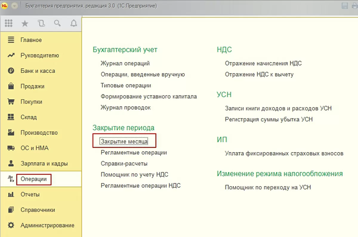 Это по сути регламентная операция, производимая раз в месяц. Все такие операции выполняются в «1С Бухгалтерия» с помощью инструмента «Закрытие месяца». Запустить его можно из раздела «Операции» основного меню системы.