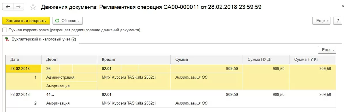 Вспомним, что способ отражения расходов по амортизации содержал для нашего основного средства два счета затрат – 26 и 44. Амортизация между счетами должна была разделиться поровну, потому что в способе указаны одинаковые коэффициенты для каждой из двух строк.