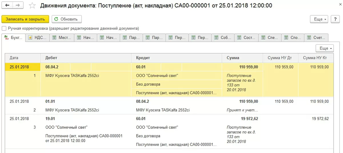 Вот так выглядят проводки для нашего основного средства, приобретение которого мы рассматриваем в данной статье.