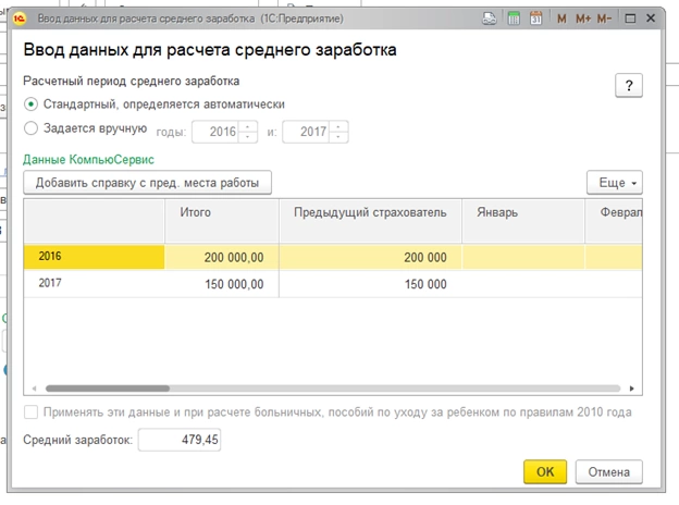 Средний заработок, для исчисления размера пособия, считается исходя из зарплаты за два года до этого. Если отработавший менее двух лет до того как заболеть работник пошел на больничный, в ЗУП необходимо ввести информацию о его заработке на предыдущих местах.