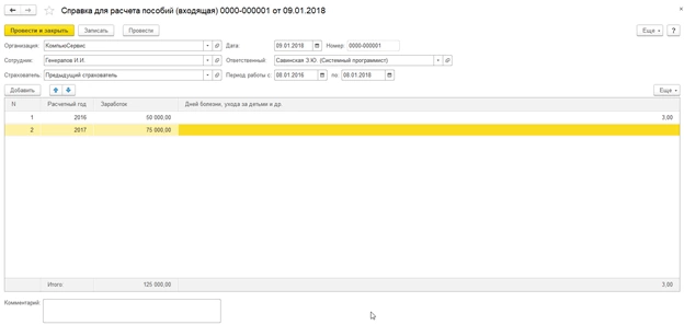 Эту информацию вставляют в «Справку для расчета пособий (входящая)» в функциональной области «Зарплата» по кнопке «Создать».