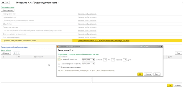 Установить его можно в непосредственно карточке сотрудника, кликнув на «Трудовую деятельность» (если этого не сделать, в «Больничном листе» будет сообщение «Не заполнен стаж, пособия могут быть рассчитаны неверно»).