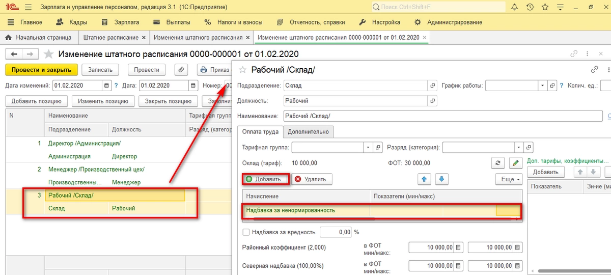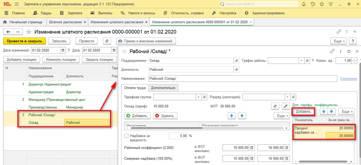 После настройки надбавок, применим их в начислении зарплаты путем внесения изменений в такие кадровые документы, как «Штатное расписание» и «Изменение плановых начислений».