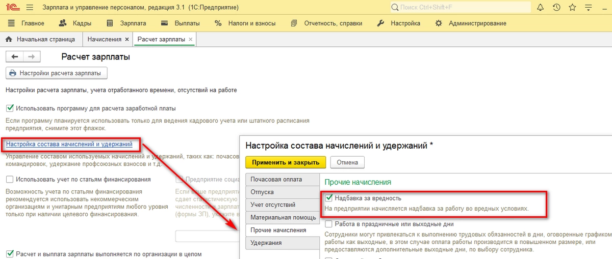 Также, например, после проведения спецоценки условий труда в организации может быть установлена надбавка за вредность. Чтобы отобразить ее в программе, в разделе «Настройка-Настройка состава начислений и удержаний» установим соответствующий флаг.