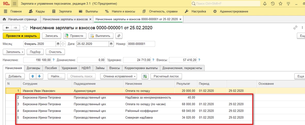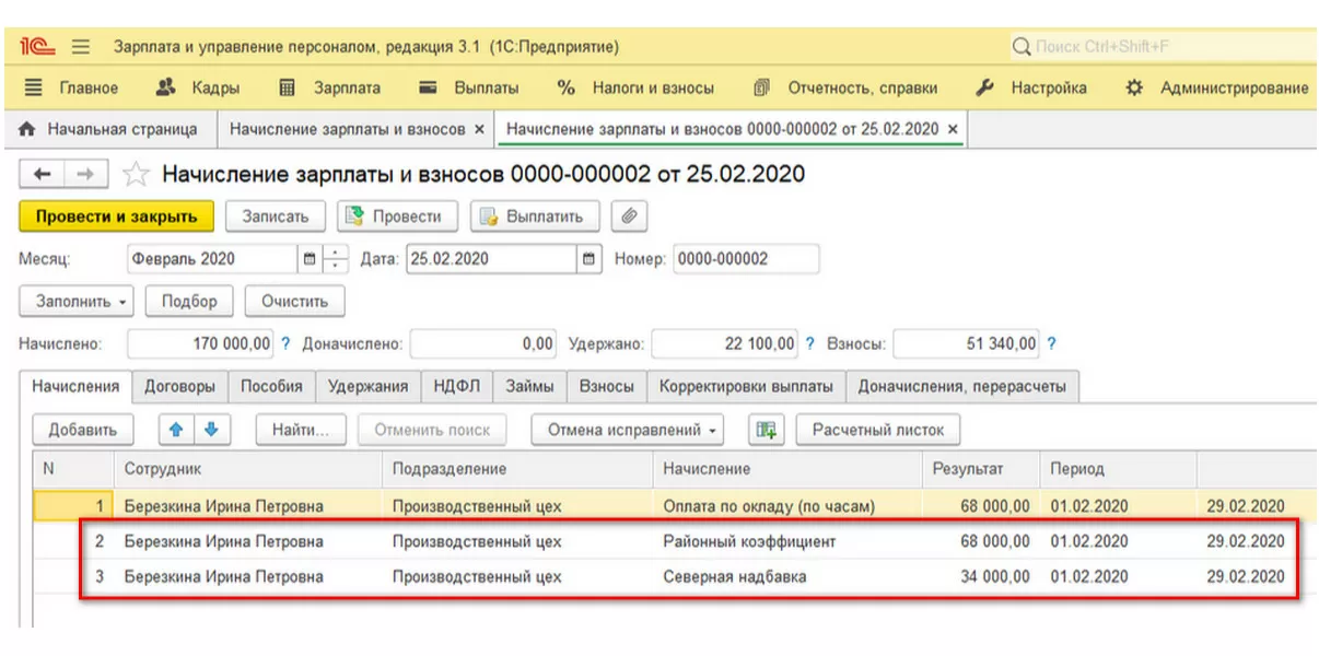 В документе «Начисление заработной платы и взносы» начисления отражены двумя отдельными строками.