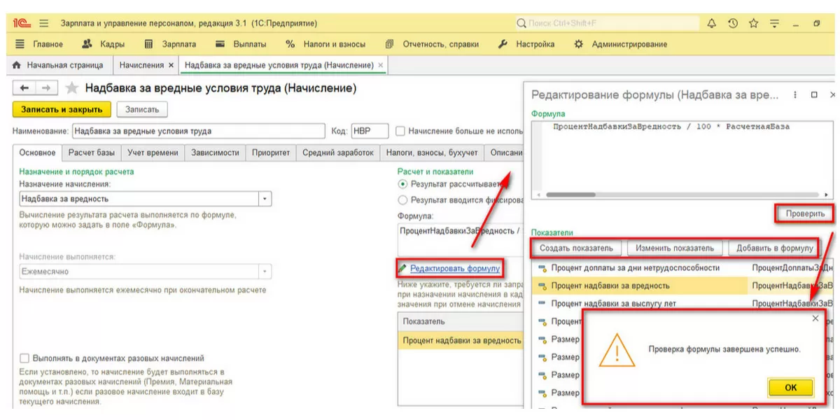 Далее все необходимые показатели добавляем в формулу, используя кнопку «Добавить в формулу», и обязательно проверяем результат по кнопке «Проверить».