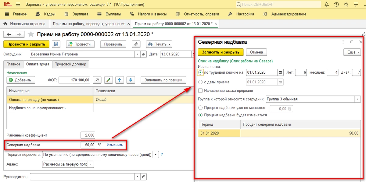 При приеме сотрудника в документе «Прием на работу» на закладке «Оплата труда» устанавливаем процент северной надбавки, для которого может быть установлено значение: