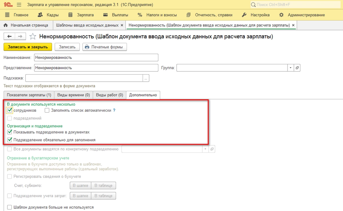 Если у предприятия имеются обособленные подразделения, отличающиеся по территориальным условиям труда, тогда устанавливаем аналогичную настройку для каждого подразделения. Для реализации этого в программе необходимо сделать следующее: зайти в карточку и установить признак наличия обособленного подразделения.
