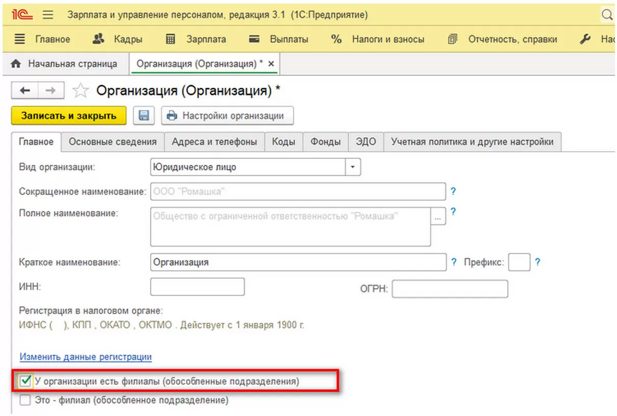 Но чтобы такая возможность появилась, на закладке «Главное» сначала нужно установить признак наличия обособленных подразделений в карточке организации, а затем уже указать в карточке обособленного подразделения районные коэффициенты.
