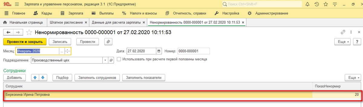 Вид начисления «Надбавка за ненормированность» для сотрудника рассчитался корректно, согласно формуле.