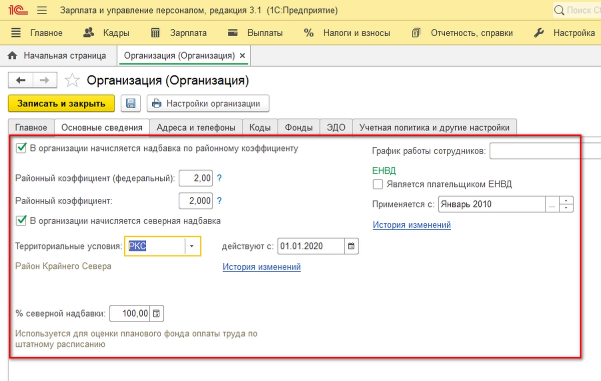 Для назначения надбавки компенсационного характера берется за основу характер или территориальные особенности условия труда. Если организация находится в местности, где действует районный коэффициент, то в карточке организации на закладке «Основные данные» необходимо эти данные указать.