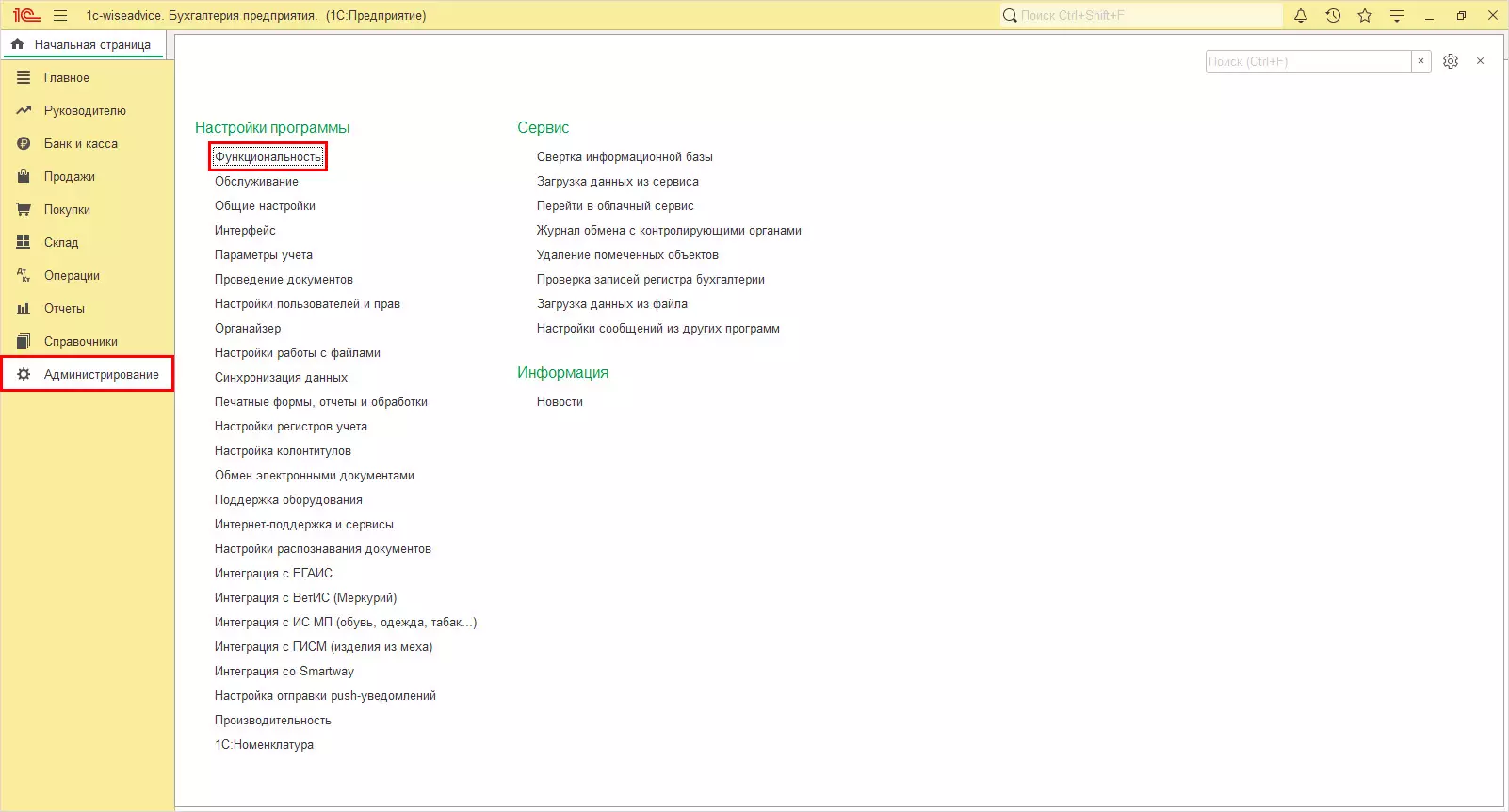 В полном интерфейсе перейдите в пункт «Администрирование» – «Функциональность».