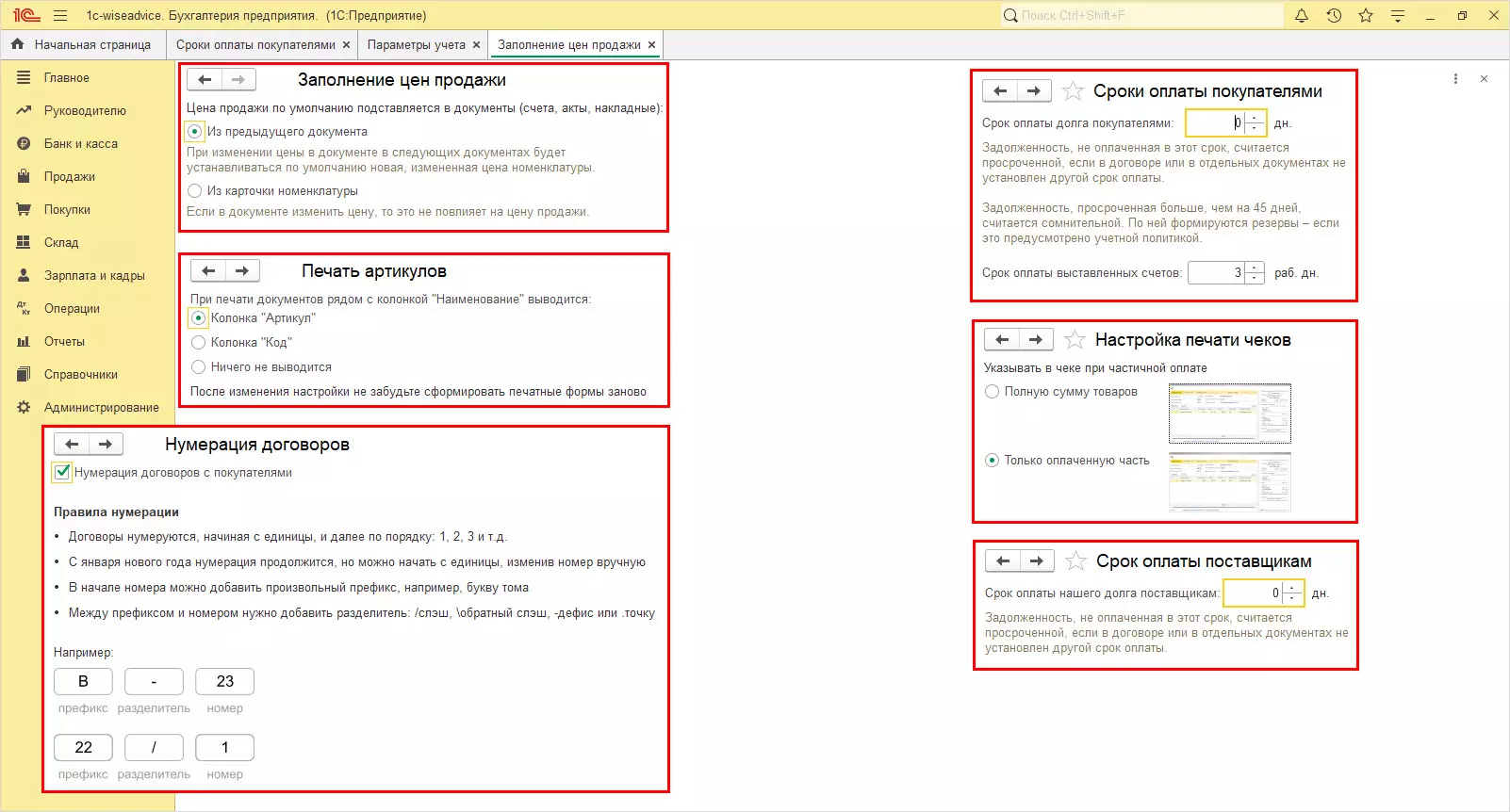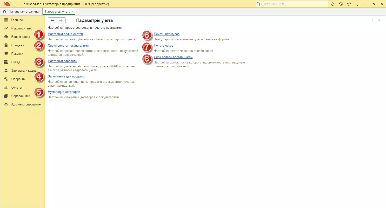 Еще один немаловажный пункт настройки – это «Параметры учета», который находится в разделе «Администрирование». Он включает восемь подразделов настройки.
