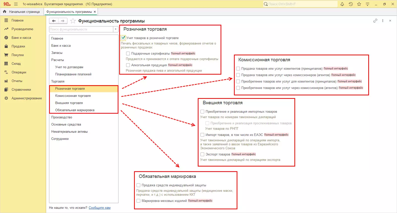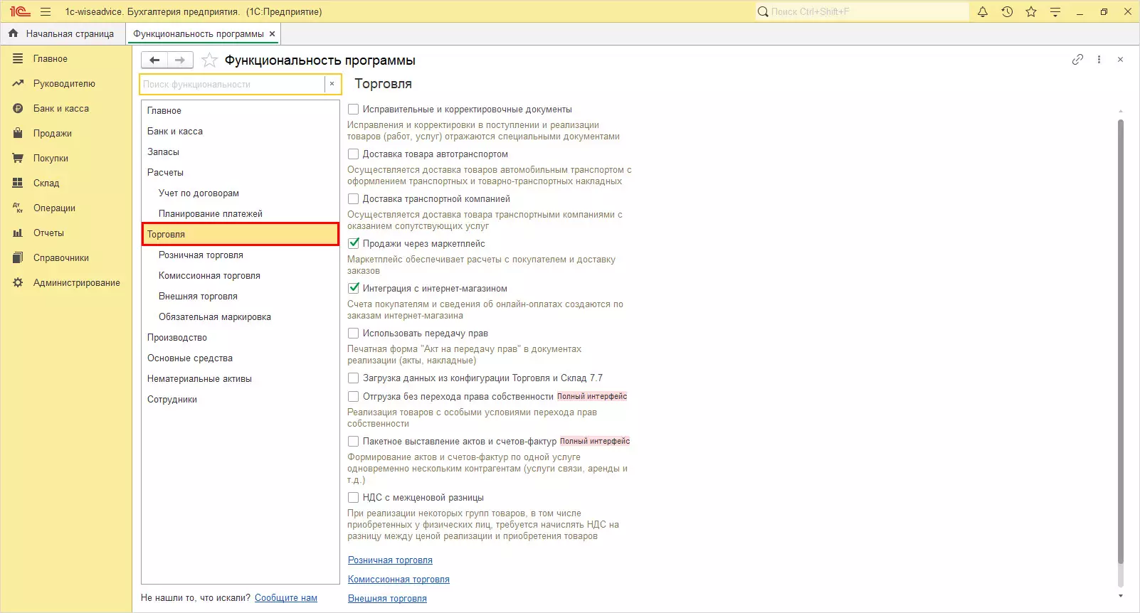 Если компания ведет торговую деятельность, уделите внимание настройкам раздела «Торговля».