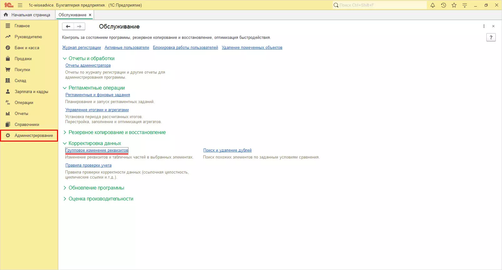 Перейдите в настройки параметров «Администрирование» – «Обслуживание» – «Групповое изменение реквизитов».
