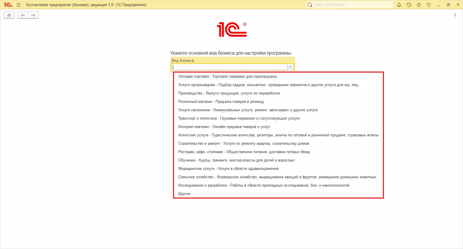 Окно 5. Выберите основной вид бизнеса. Установить можно произвольно. Функциональность в дальнейшем можно дополнить. Данная настройка в Бухгалтерии 1С активирует основные блоки программы.