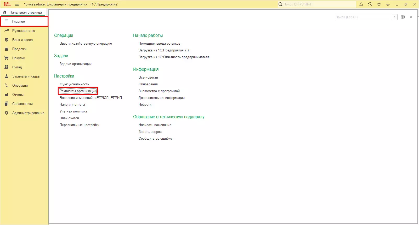 Данные о компании можно внести вручную. В простом интерфейсе это блок «Настройки» – «Основное», а для предпочитающих полный интерфейс и меню сбоку – «Главное» – «Реквизиты организации».