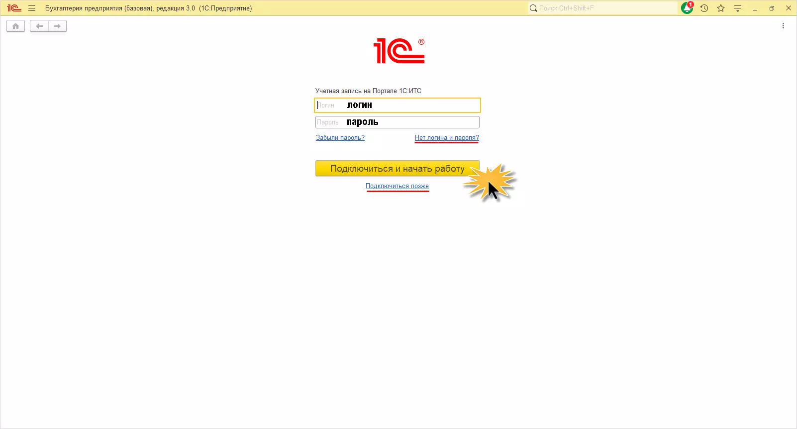 Если конфигурация еще не зарегистрирована, нажмите на гиперссылку-вопрос «Нет логина и пароля?».